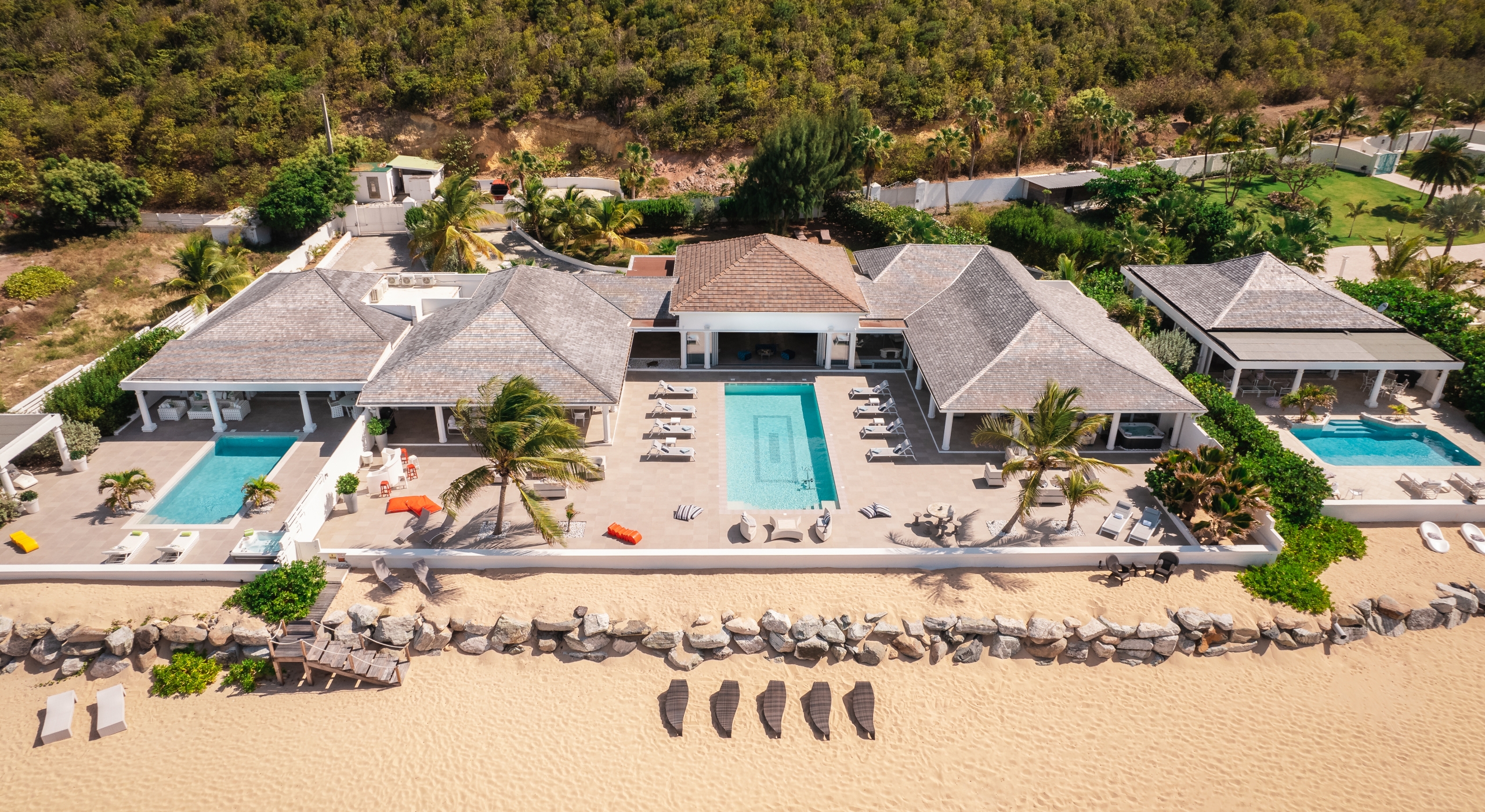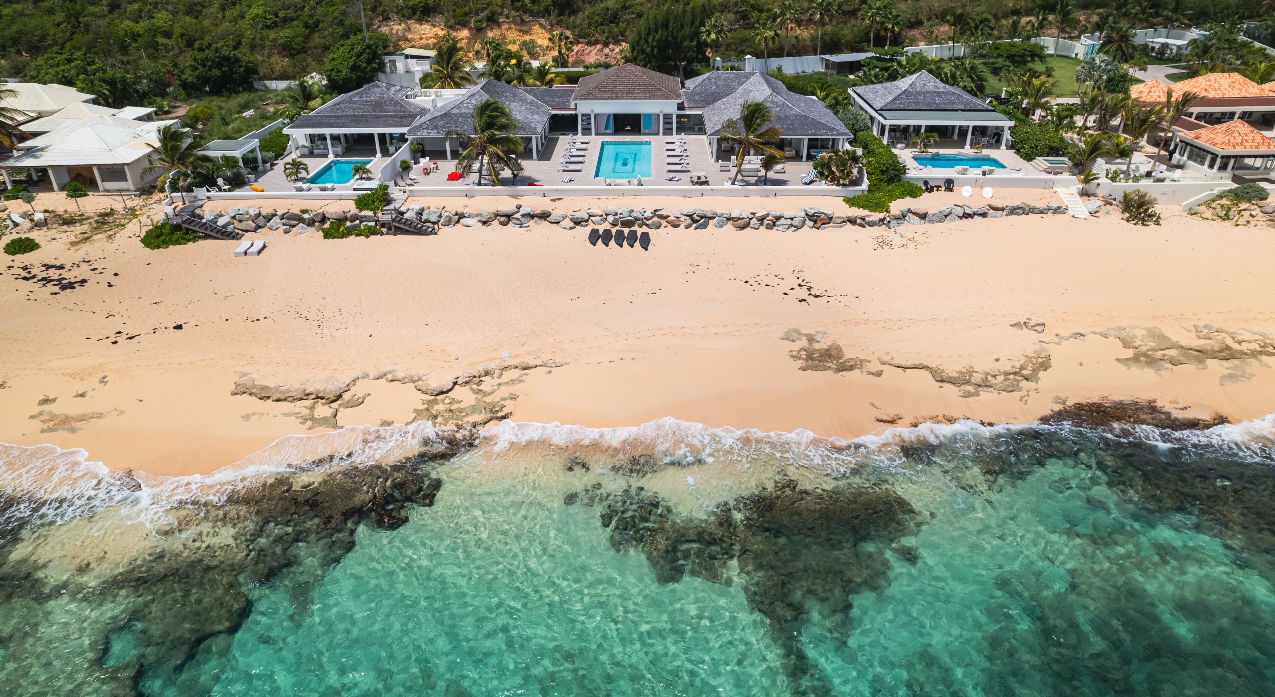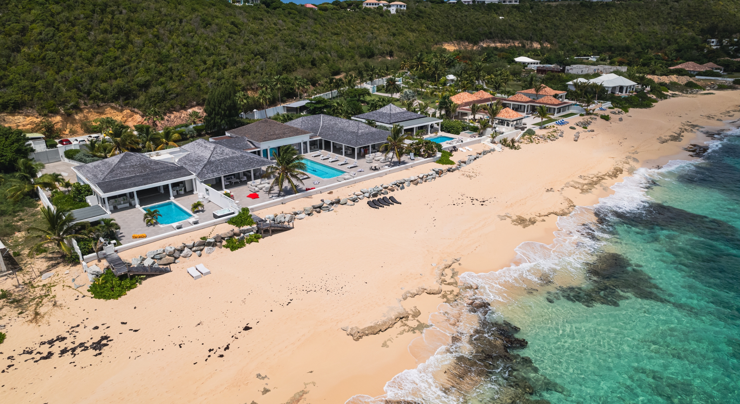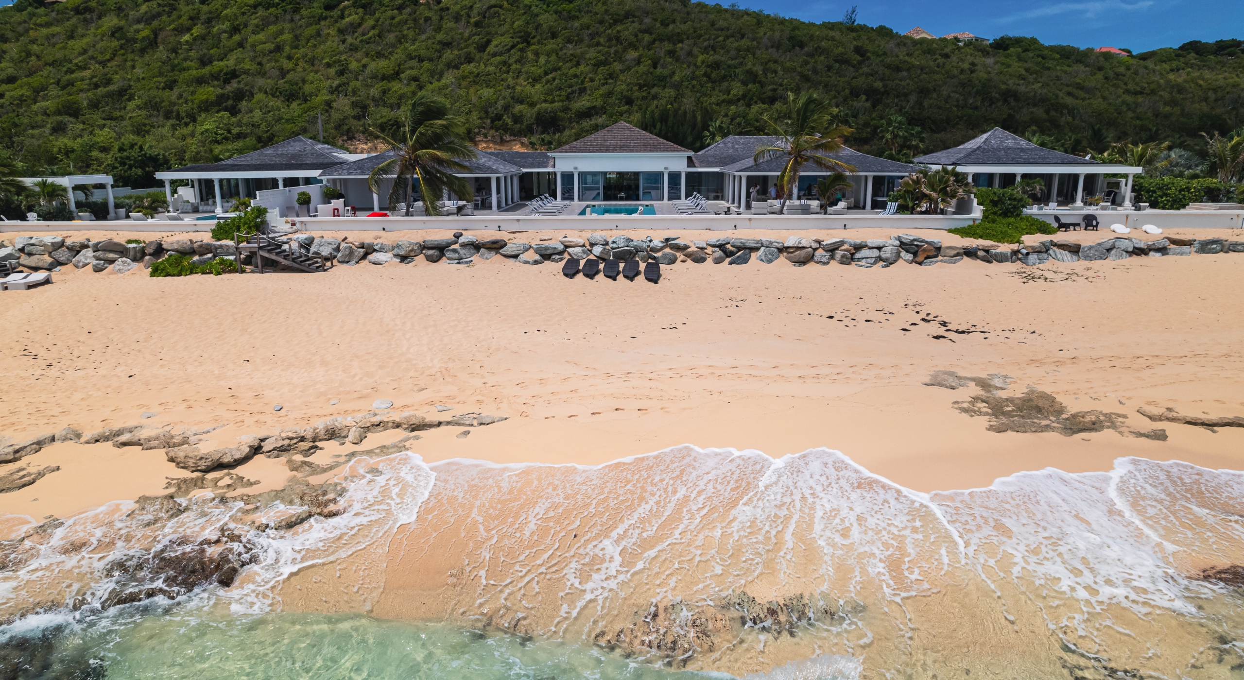 With the two neighboring sister villas, this newly reconstructed 5 BR beachfront property