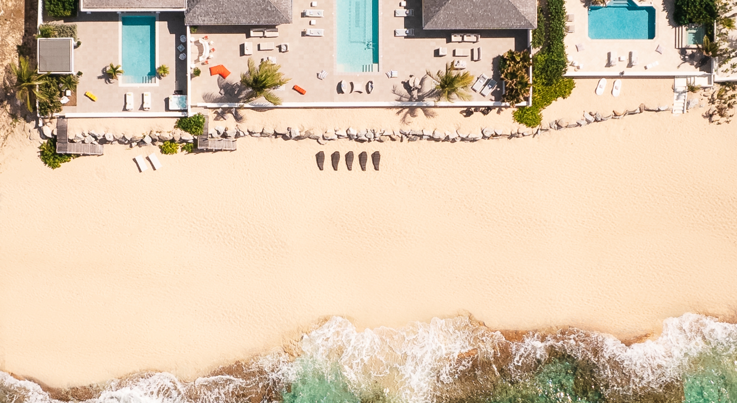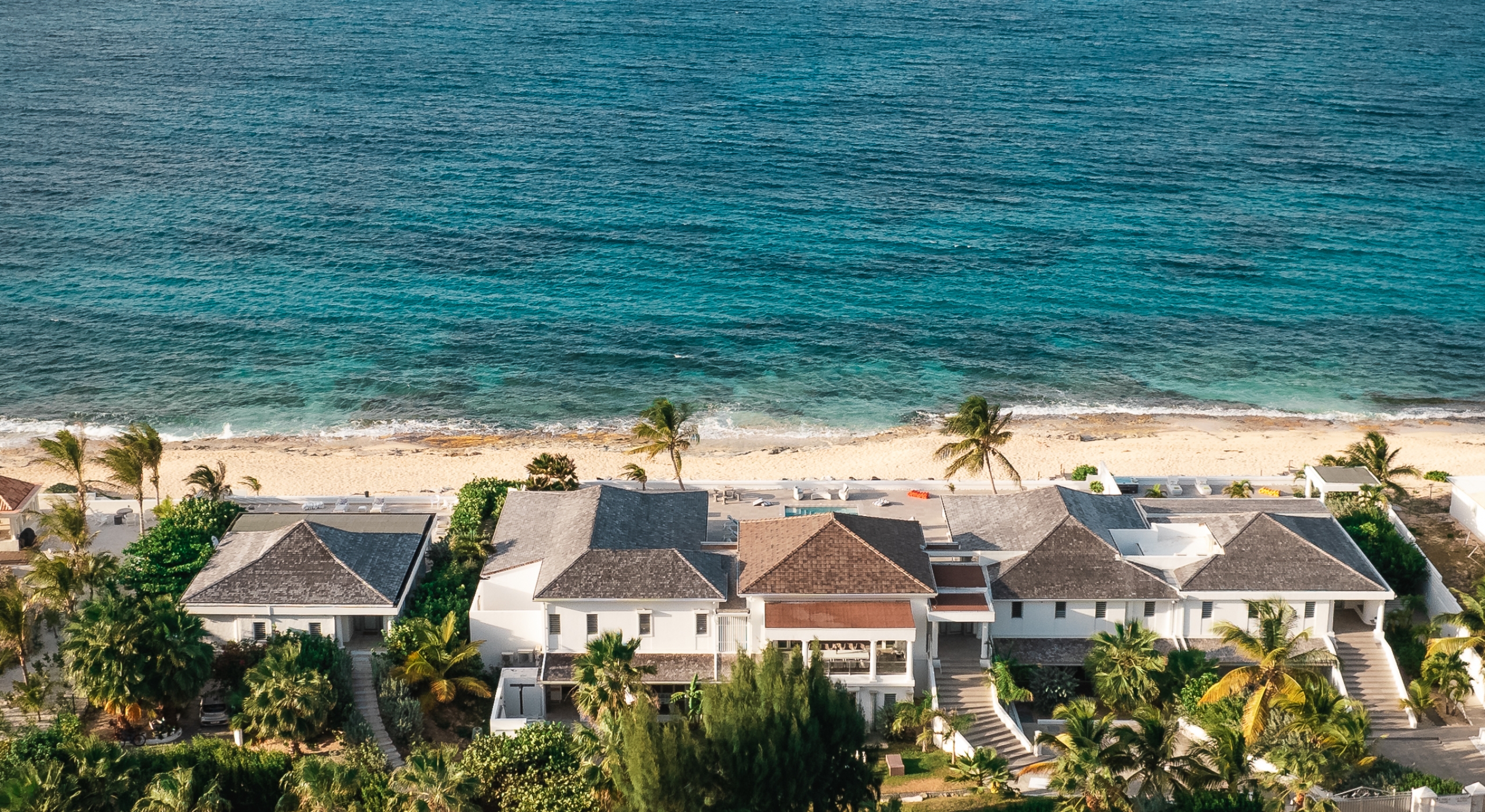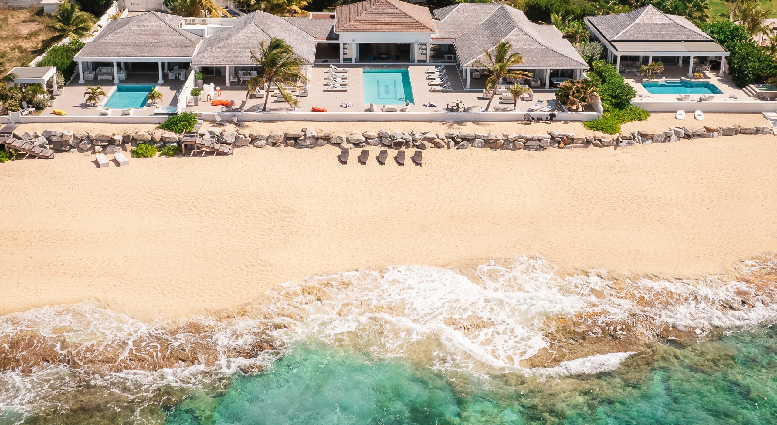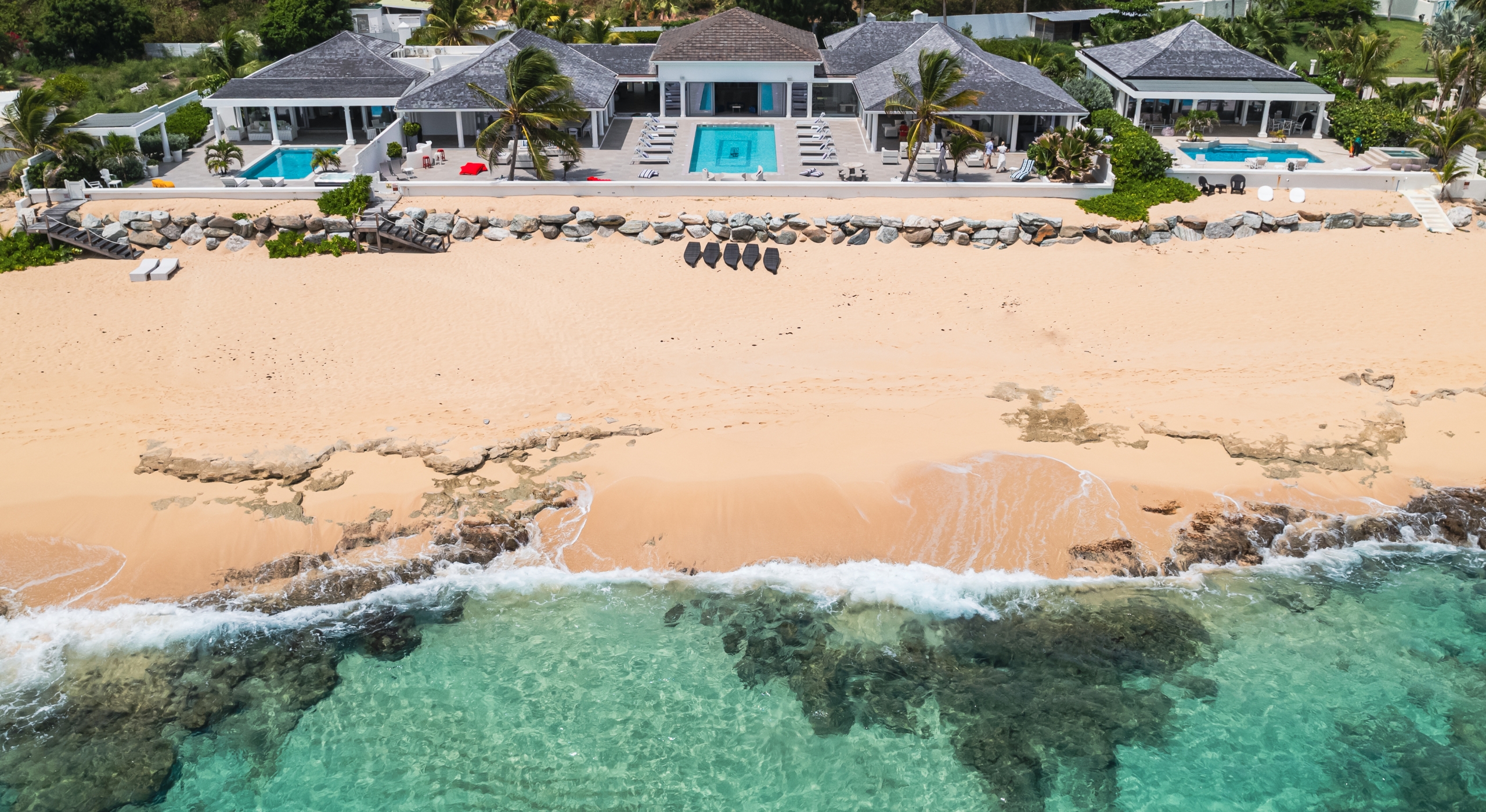With the two neighboring sister villas, this newly reconstructed 5 BR beachfront property