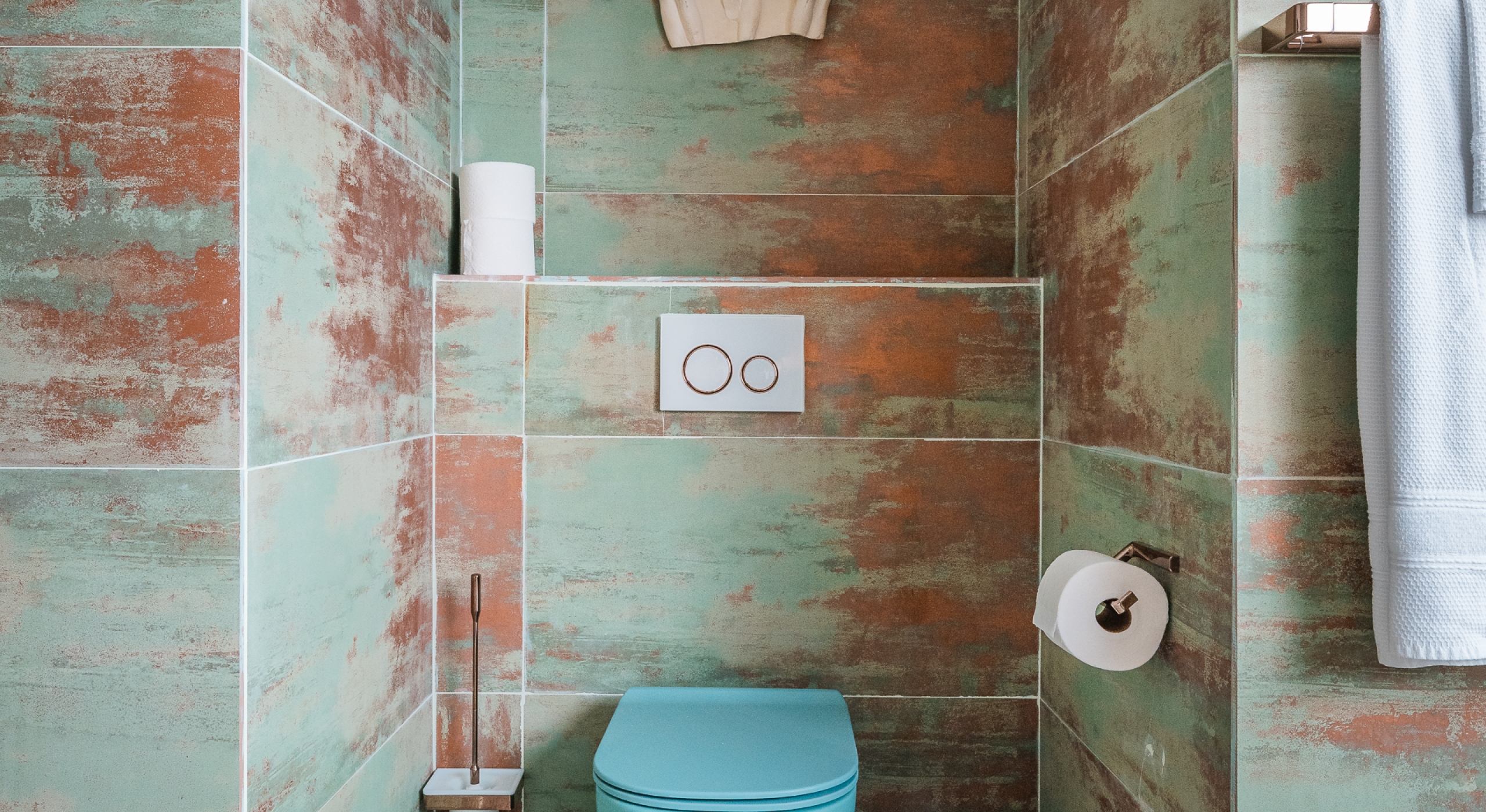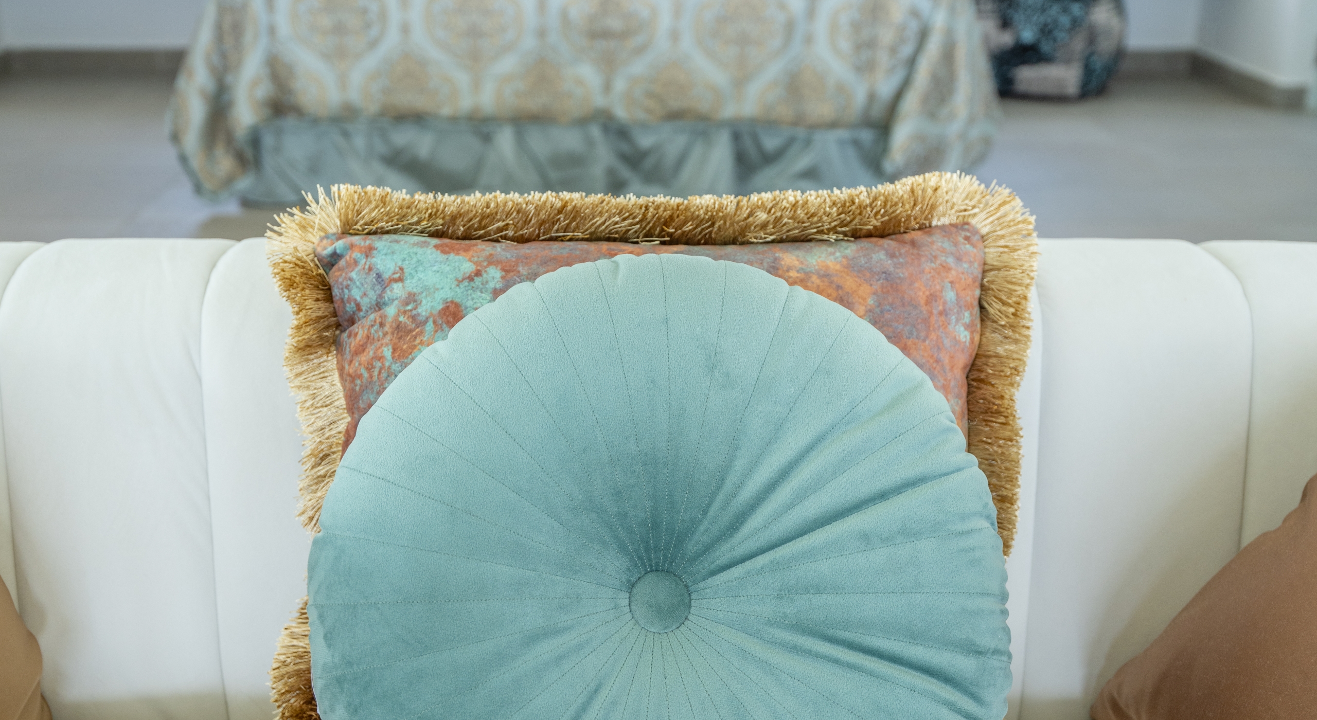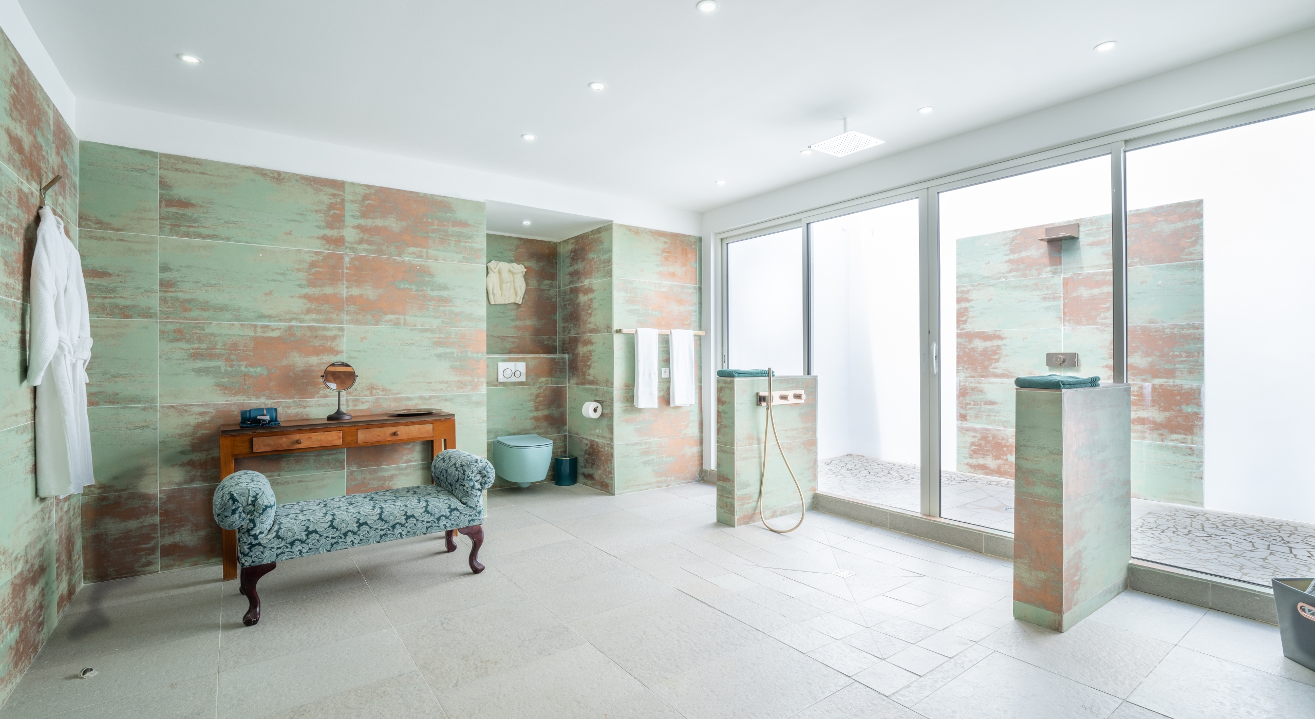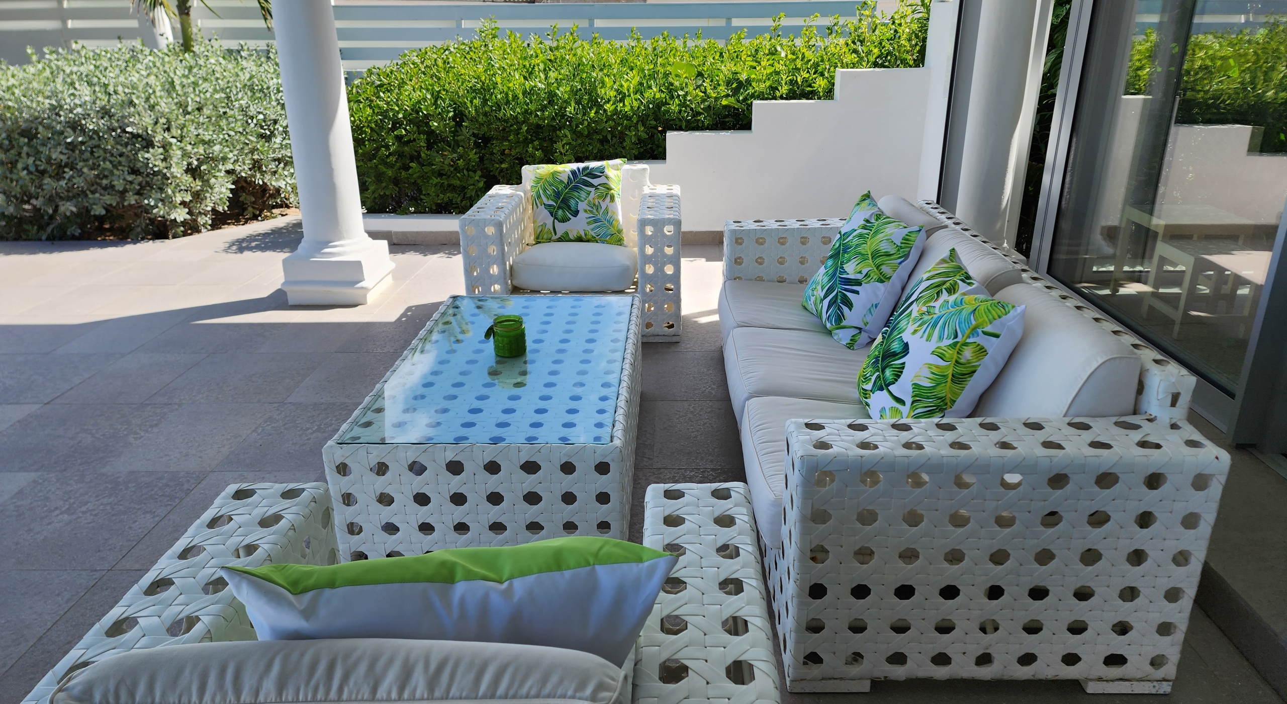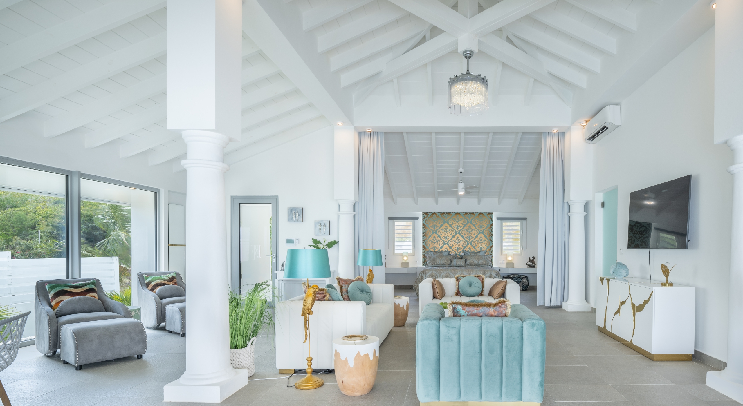 The villa’s living room opens to the terrace and is grandiose both in size and style. It features